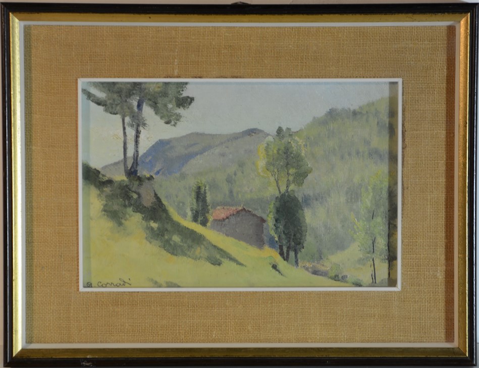 Alfonso Corradi "Paesaggio montano con baita" olio su compensato (cm 19x29) Firm