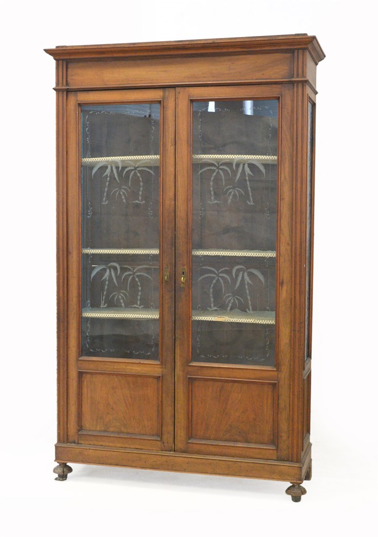Vetrina a due ante con vetri incisi a palme e volute, montanti scanalati, piedi anteriori torniti, secolo XX. (cm 140x223x439) (difetti)