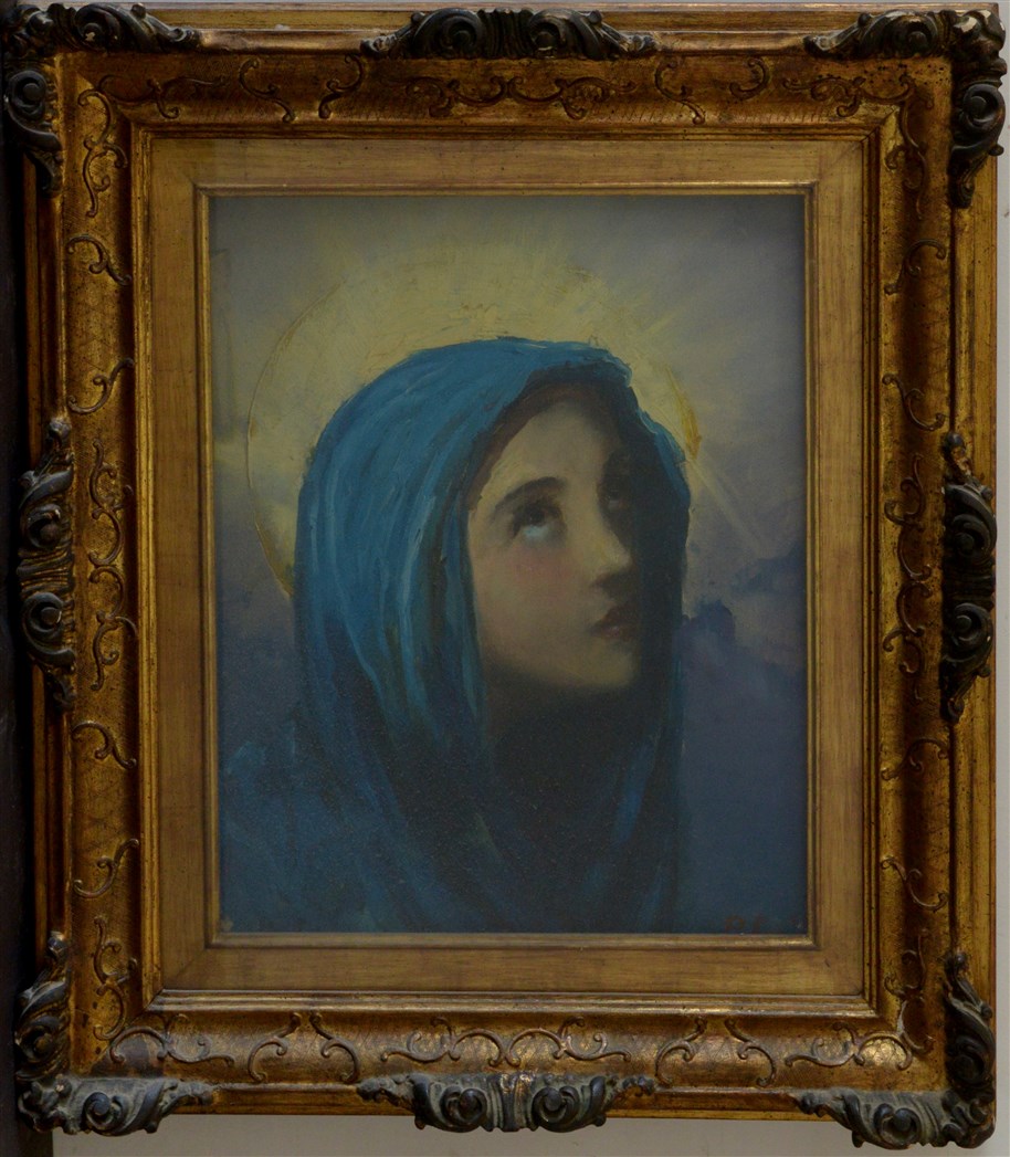 Firma indecifrata "Madonna" olio su tela (cm 60x50) Firmato in basso a destra; dedicato, firmato e datato al retro. In cornice (lievi difetti)