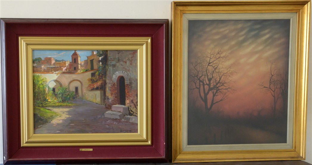 Lotto di due dipinti ad olio raffiguranti un interno rurale ed un paesaggio not