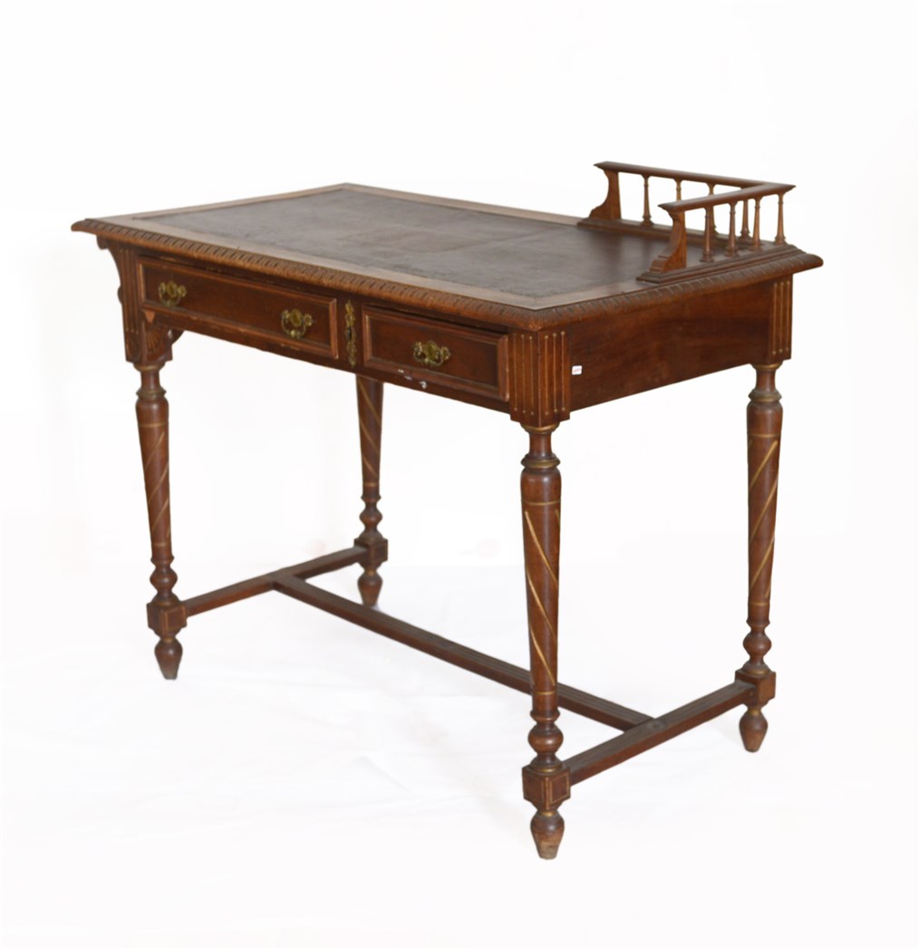 Scrittoio a due cassetti in linea, gambe tornite riunite da traverse piatte, inizio secolo XX. (cm 109x90x60) (difetti e mancanze)