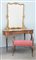 Toilette di forma mossa a tre cassetti con fascia e piano radicati e filettati, gambe con intagli a motivi fogliacei, completa di panchetto e specchiera con cornice dorata non pertinente (difetti)