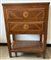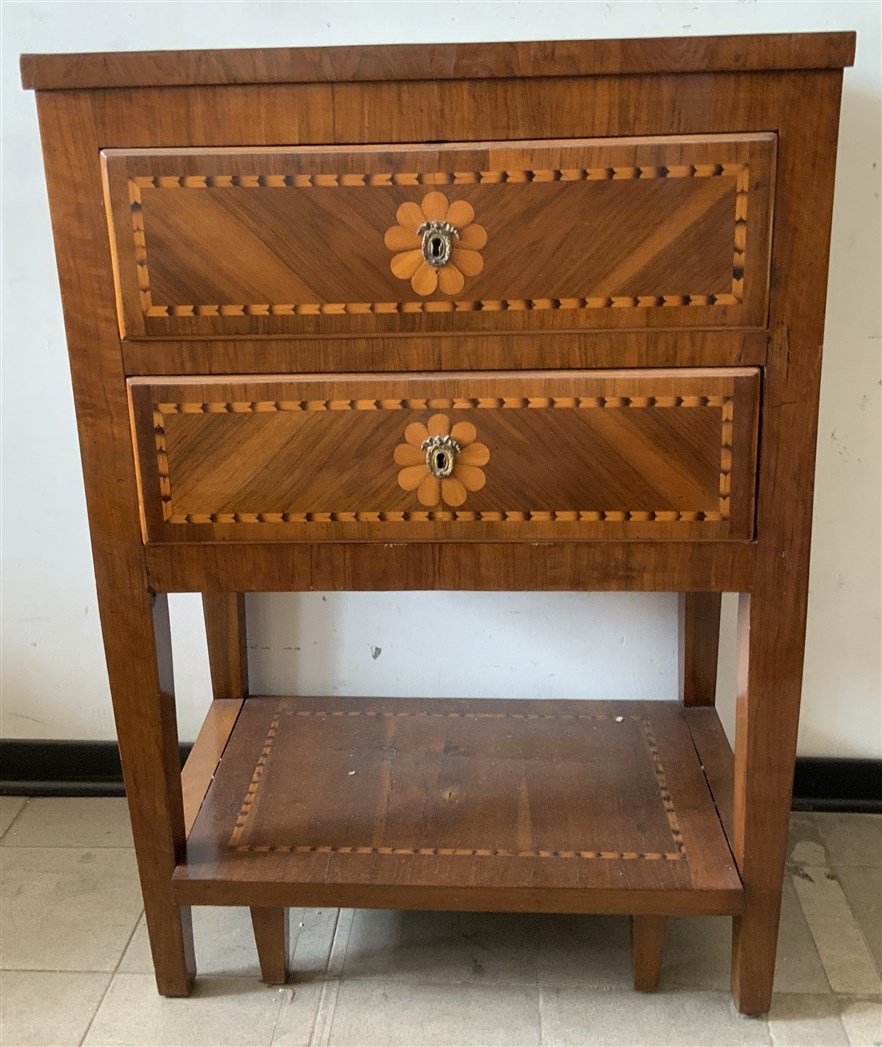 Comodino lastronato in noce e intarsiato in legno chiaro a motivi geometrici e fiori. Fronte a due cassetti, gambe rastremate, seconda metà secolo XVIII (cm 57x80x35) (difetti)