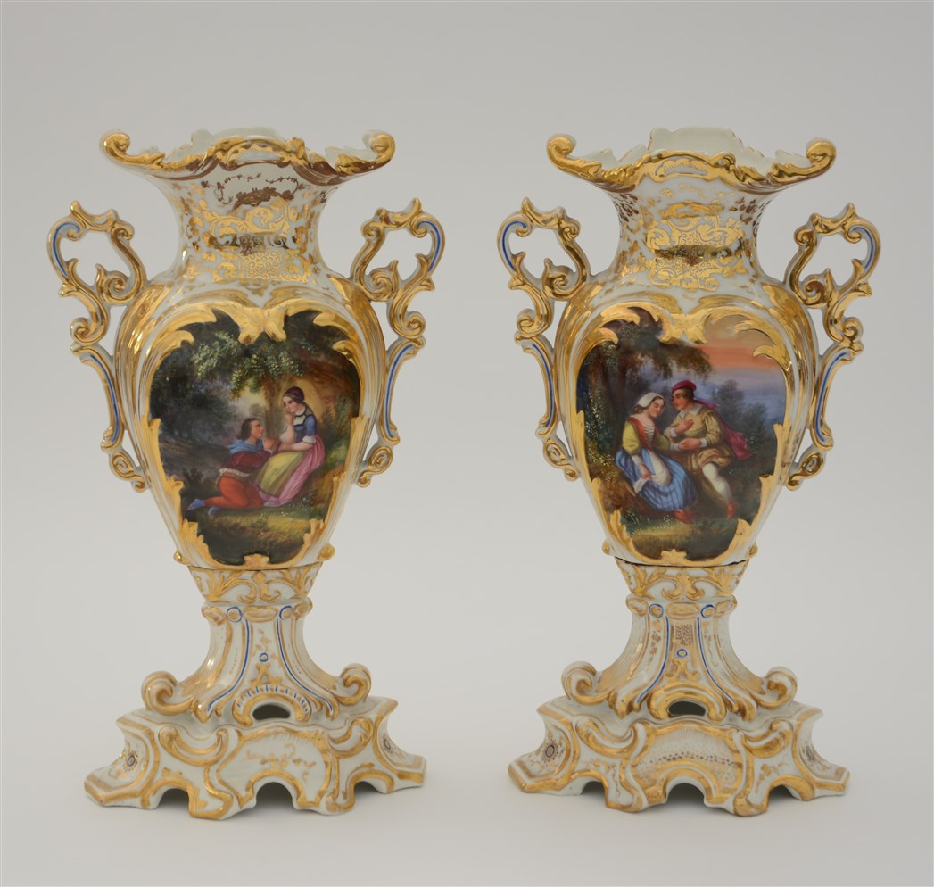 coppia di vasi biansati di forma mossa con scene galanti (lievi difetti)