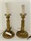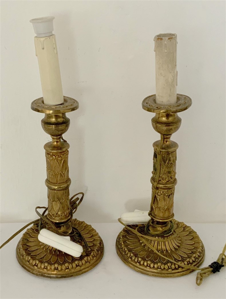 Coppia di candelieri in bronzo dorato con corpo e piede sbalzato a motivi fogliati (h. cm 23) montati a luce elettrica
