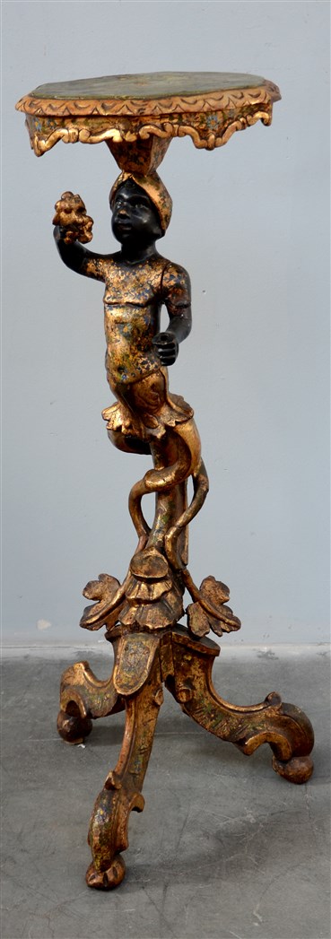 Gueridon in legno laccato e dorato con piano sagomato decorato a finto marmo sorretto da figura di moro. Base tripode scolpita a volute. Secolo XIX (h. cm 96) (restauri)