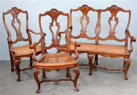 Fornitura da salotto composta da un divanetto e due poltrone in legno con schienali, braccioli e gambe mosse, cimasa intagliata a valva di conchiglia (difetti)