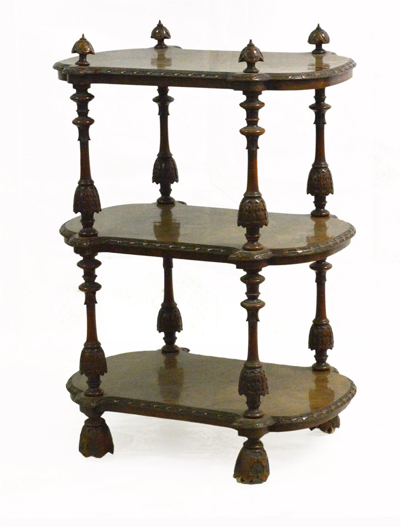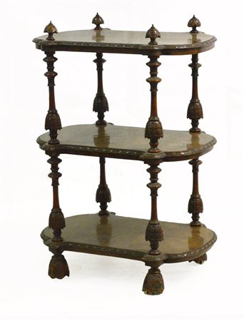 Etagere lastronata a tre piani di forma mossa con montanti torniti e intagliati