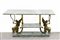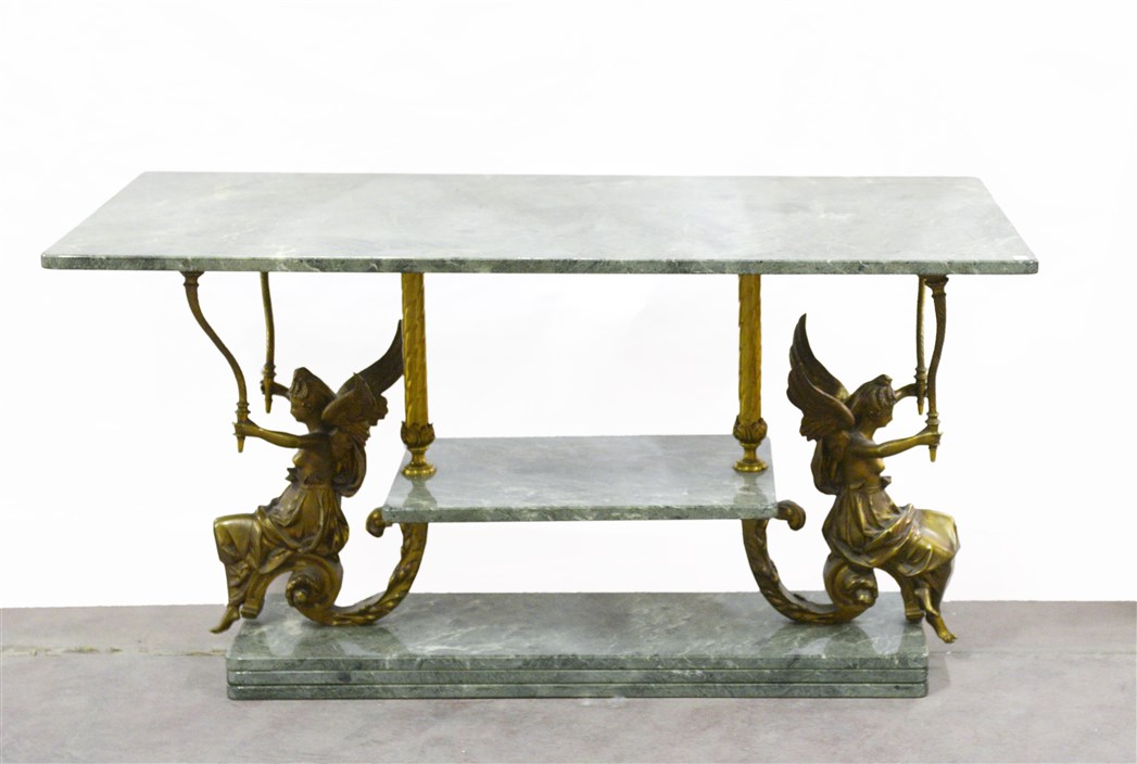 Tavolino da salotto a tre ripiani decorati a marmo verde con montanti in metallo dorato decorato a figure alate femminili (cm 130x66x70) (difetti)