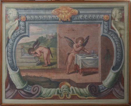 Ignoto del secolo XX "Putti in un paesaggio" strappo d'affresco (cm 140x174) In cornice (difetti)