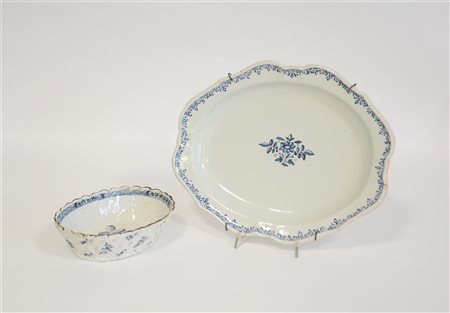 Lotto composto da un vassoio polilobato ed una vaschetta ovale in maiolica con decoro blu, misure diverse (difetti e restauri)