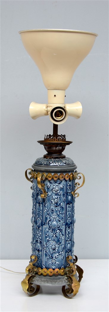 Lampada in ceramica decorata nei toni del bianco e del blu con motivi floreali in rilievo, guarnizioni in metallo dorato (h. cm 46) (difetti, montata a luce elettrica)