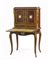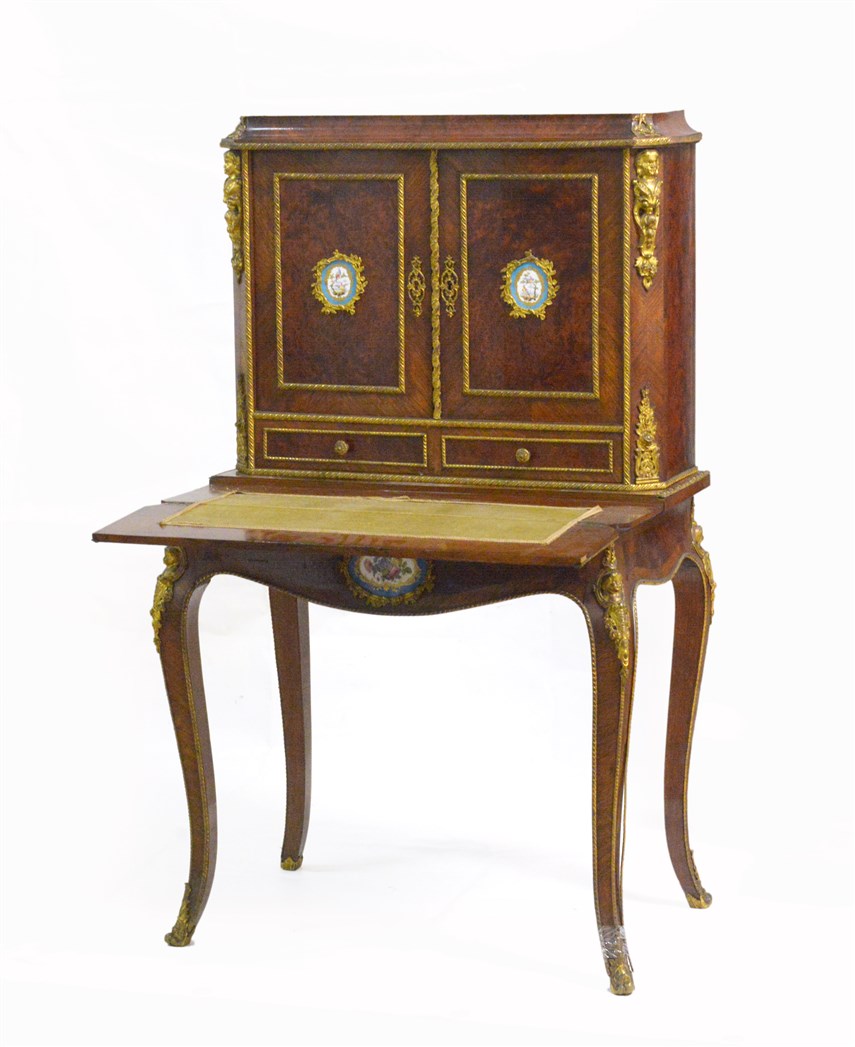 Scrittoio con alzata a due ante e due cassetti, parte inferiore a gambe mosse ed un cassetto. Profili in metallo dorato e placche in porcellana dipinte in policromia a volatili e fiori (cm 76x130x47) (difetti)