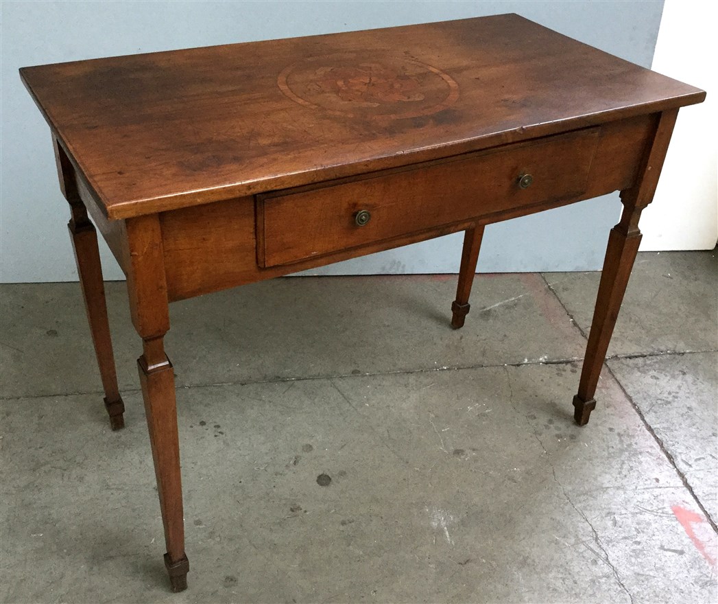 Tavolino con gambe rastremate e un cassetto nella fascia, piano centrato da intarsio a motivo floreale. Secolo XIX (cm 107x82x54) (difetti)
