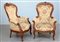 Coppia di poltrone con struttura mossa in legno intagliato e rivestimento in tessuto operato (difetti)