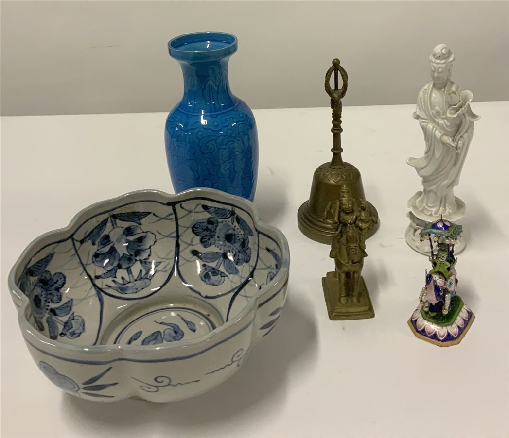 Lotto composto da sei oggetti diversi in bronzo, ceramica e smalti di manifattura asiatica di epoche e misure diverse (difetti)