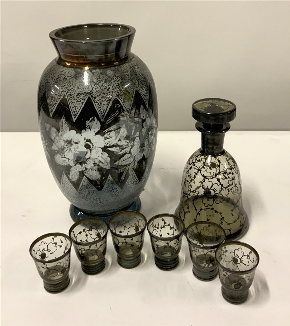 Lotto composto da un servizio da rosolio e un vaso in vetro decorato in argento
