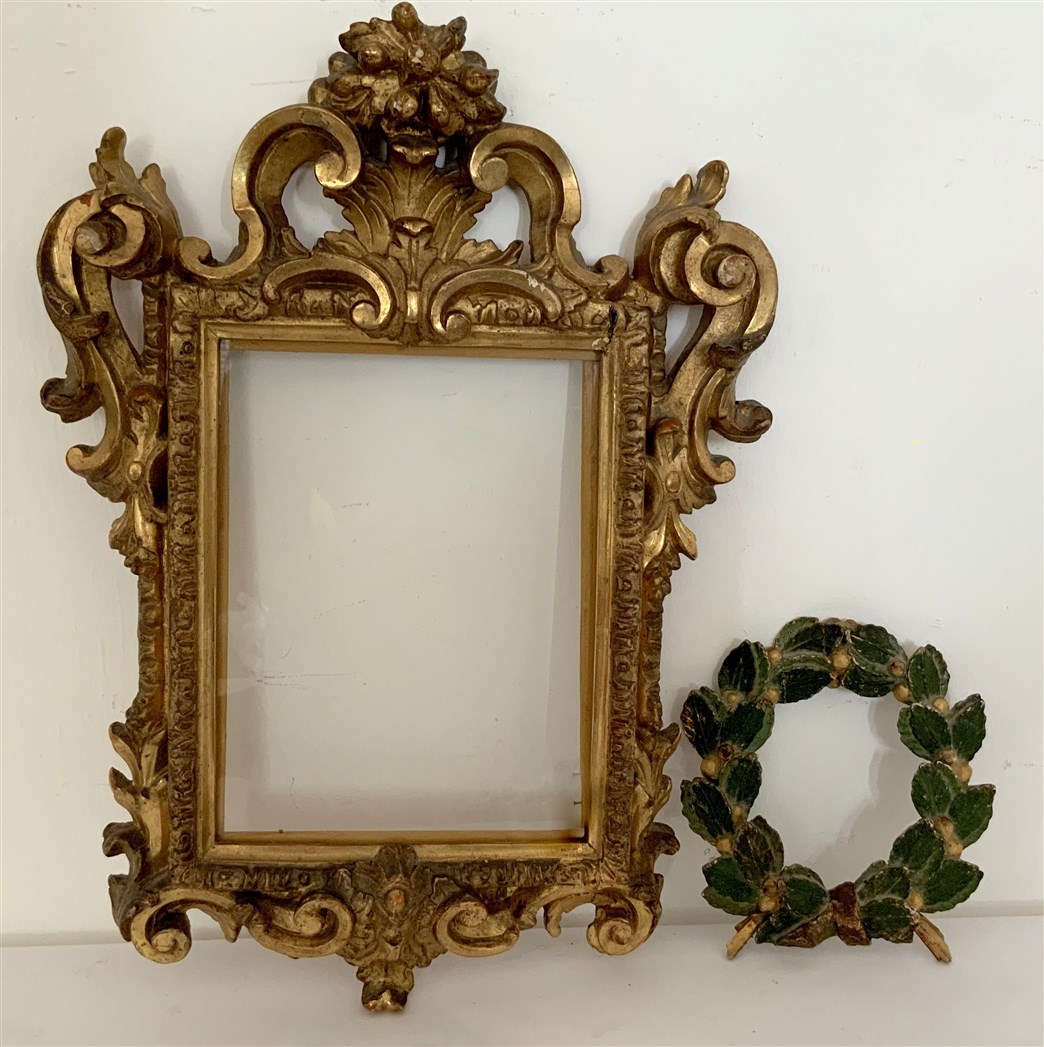Lotto composto da due cornici del secolo XIX una in legno dorato e l'altra in legno policromo scolpito a foglie di alloro, misure diverse (difetti)