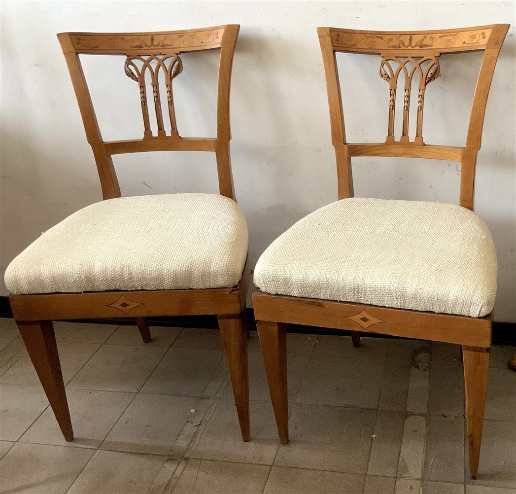 Coppia di sedie in noce con schienale traforato e e intarsiato a motivi vegetal