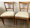 Coppia di sedie in noce con schienale traforato e e intarsiato a motivi vegetali. Gambe anteriori a obelisco rovesciato e posteriori a sciabola. Secolo XIX (difetti)