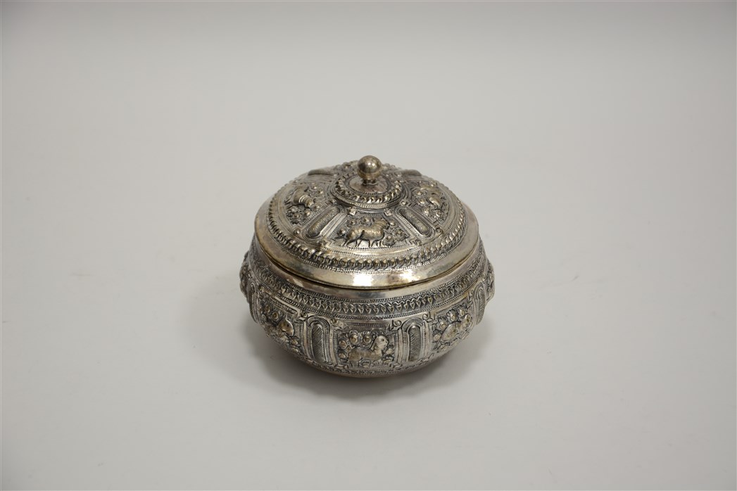 Scatola in argento decorata in rilievo ad animali e fiori (lungh. cm 12) (g 235 ca.)