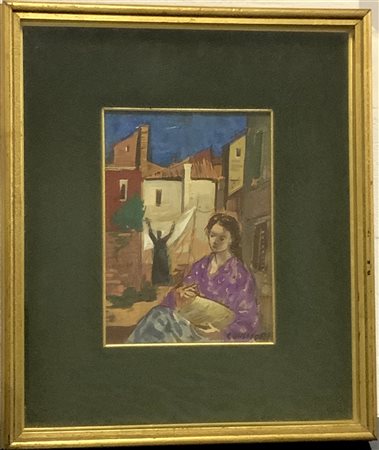 "Paesaggio con figure" tecnica mista (cm 22x17) Firmato in basso a destra. In cornice