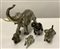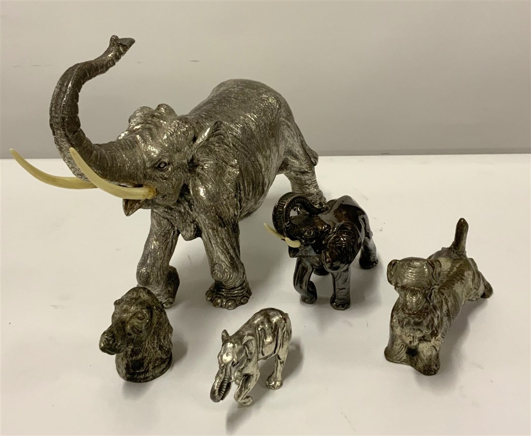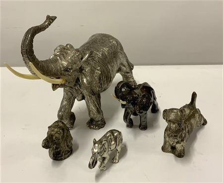 Lotto composto da cinque statuette in lamina d'argento e metallo raffiguranti animali (difetti)