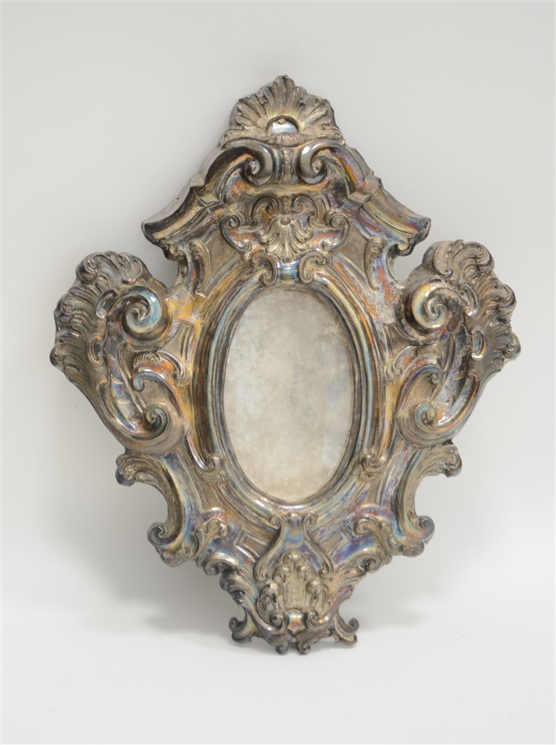 Cartagloria in argento sbalzato a volute fogliate. Marchio di Napoli, secolo XIX (cm 32x26) (g 380 ca.)