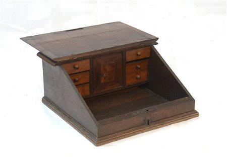 Scrittoio da appoggio con anta apribile celante sei cassettini e sportello (cm 61x28x57) (difetti, mancante di una chiave)