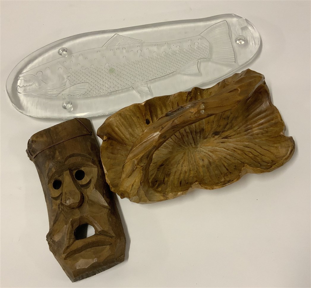 Lotto composto da una maschera in legno, un centrotavola ed un vassoio in legno (difetti)