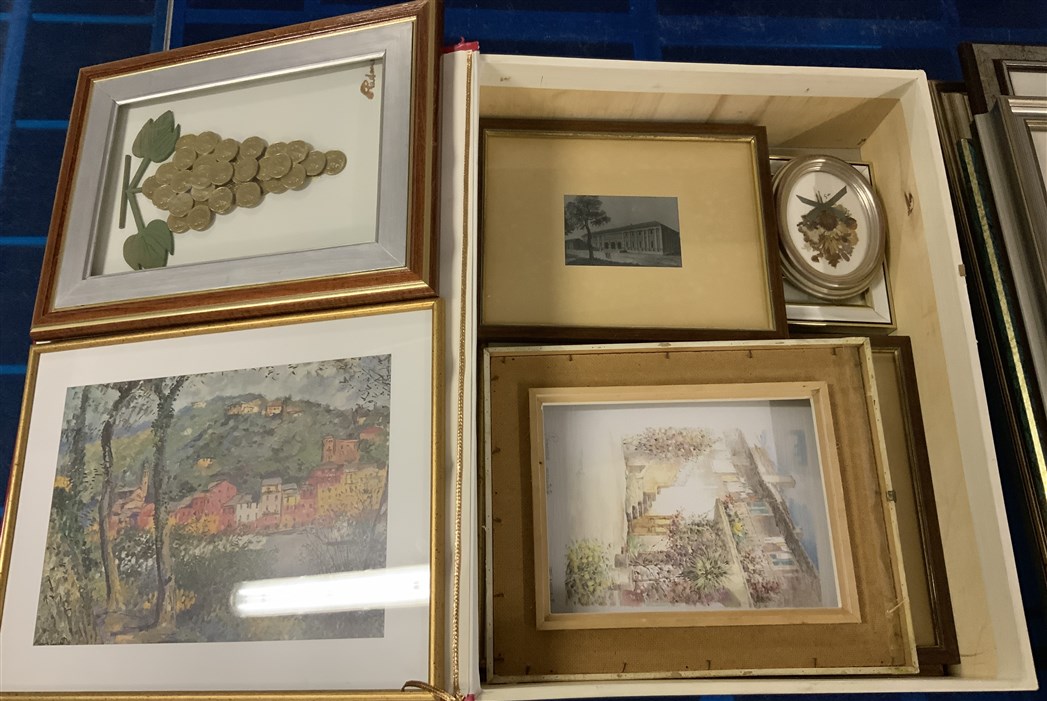 Lotto composto da numerose cornici contenenti riproduzioni e stampe (difetti)