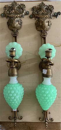 Coppia di appliques in bronzo ad una fiamma decorate a teste di ariete e in opaline con pigna (h. cm 65) (difetti)