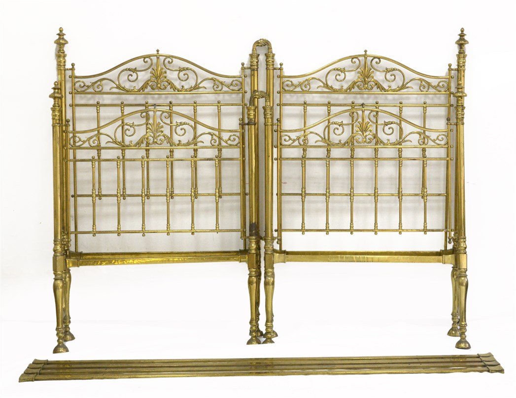Letto a due piazze in ottone con cimase e pediere decorate a motivi vegetali, montanti terminanti a pinnacoli e mani. Secolo XIX (difetti)