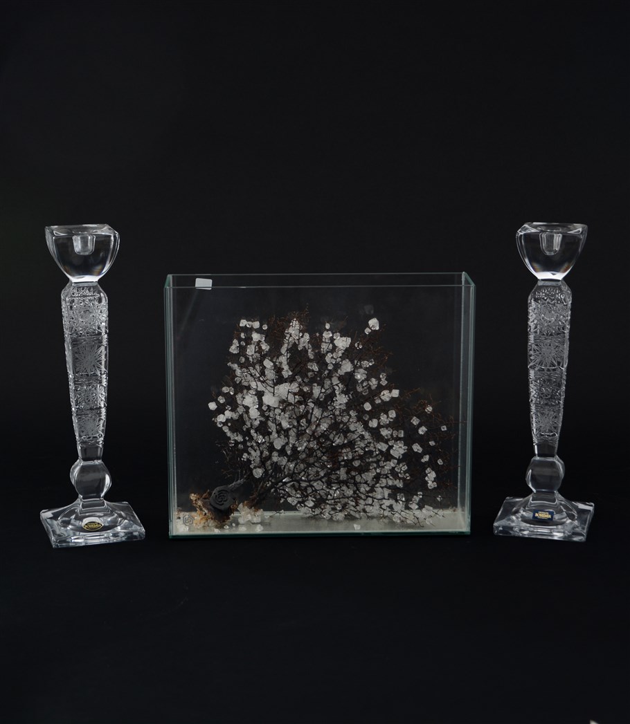 Lotto composto da una coppia di portacandele in vetro cristallo e una teca contenente rami di corallo con elementi in cristallo (lievi difetti)