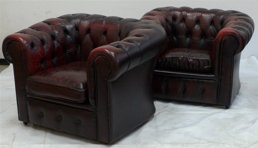 Coppia di poltrone in pelle capitonné con cuscino asportabile. Italia, anni '80. (cm 90x70x74) (difetti)