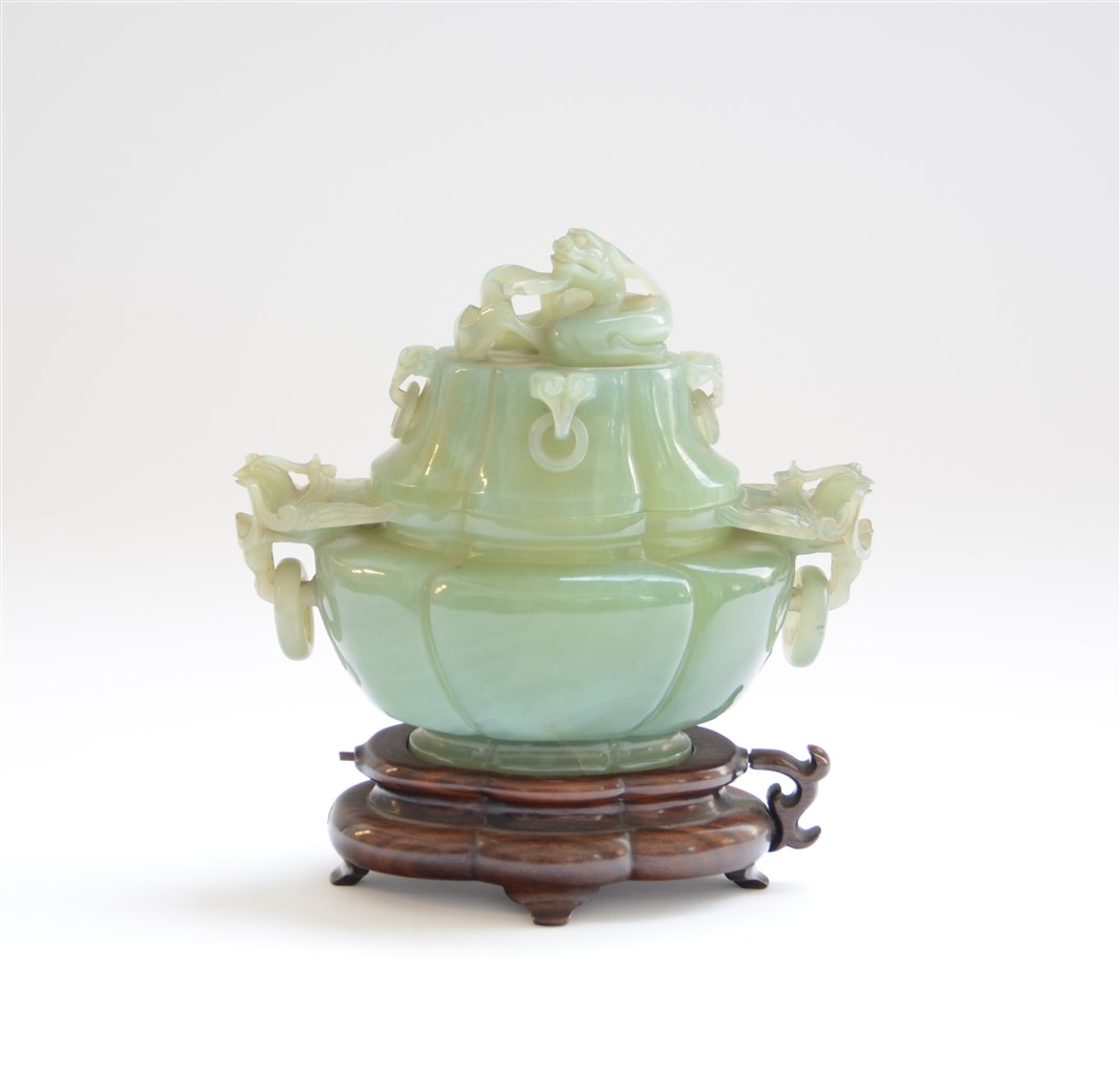 Incensiere con coperchio in pietra dura dalla forma quadrilobata, anse a guisa