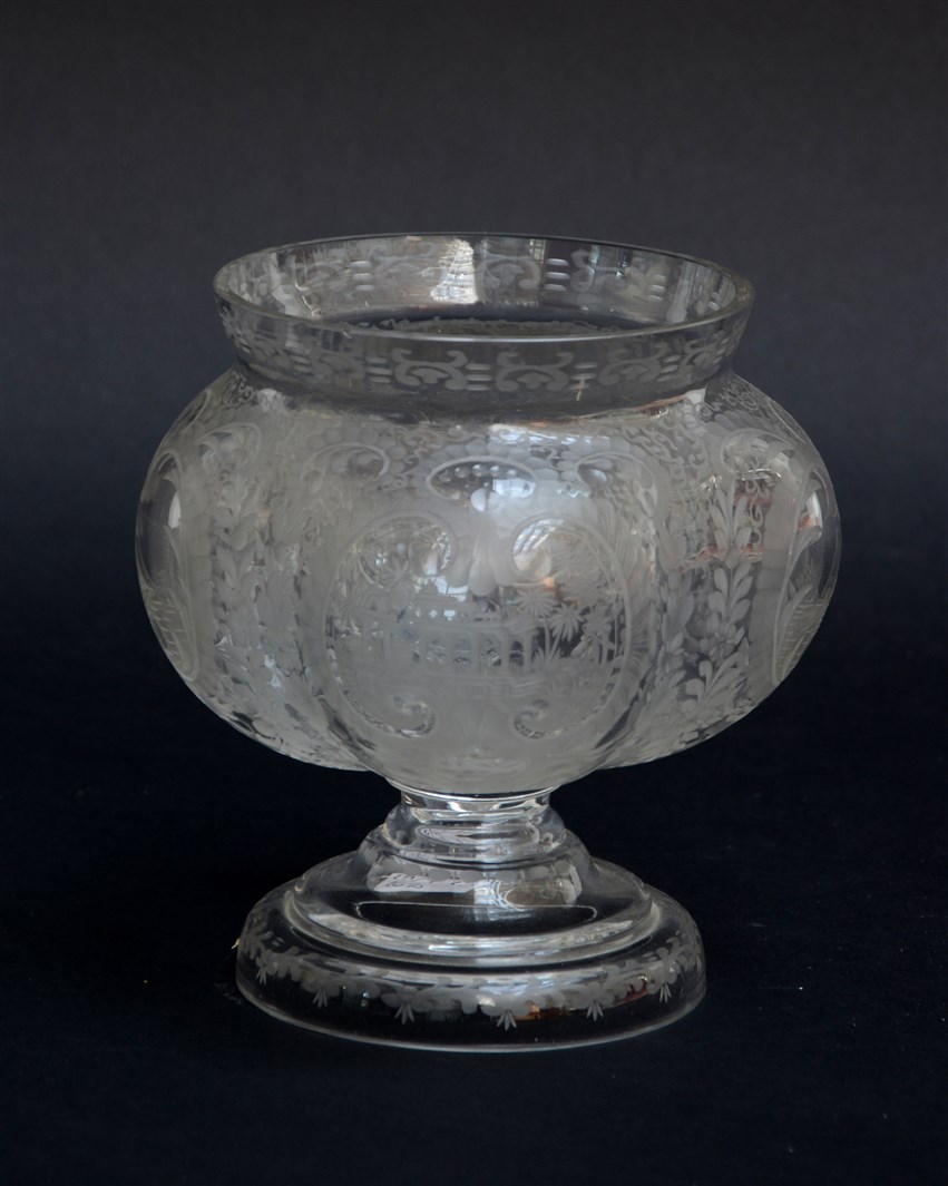 Manifattura dell'inizio del secolo XX. Vaso bugnato in vetro incolore inciso a mazzi fioriti e paesaggi (h. cm 15)