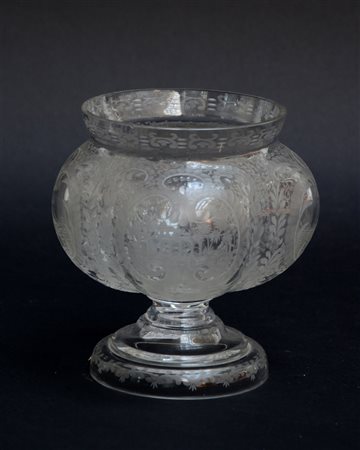 Manifattura dell'inizio del secolo XX. Vaso bugnato in vetro incolore inciso a