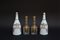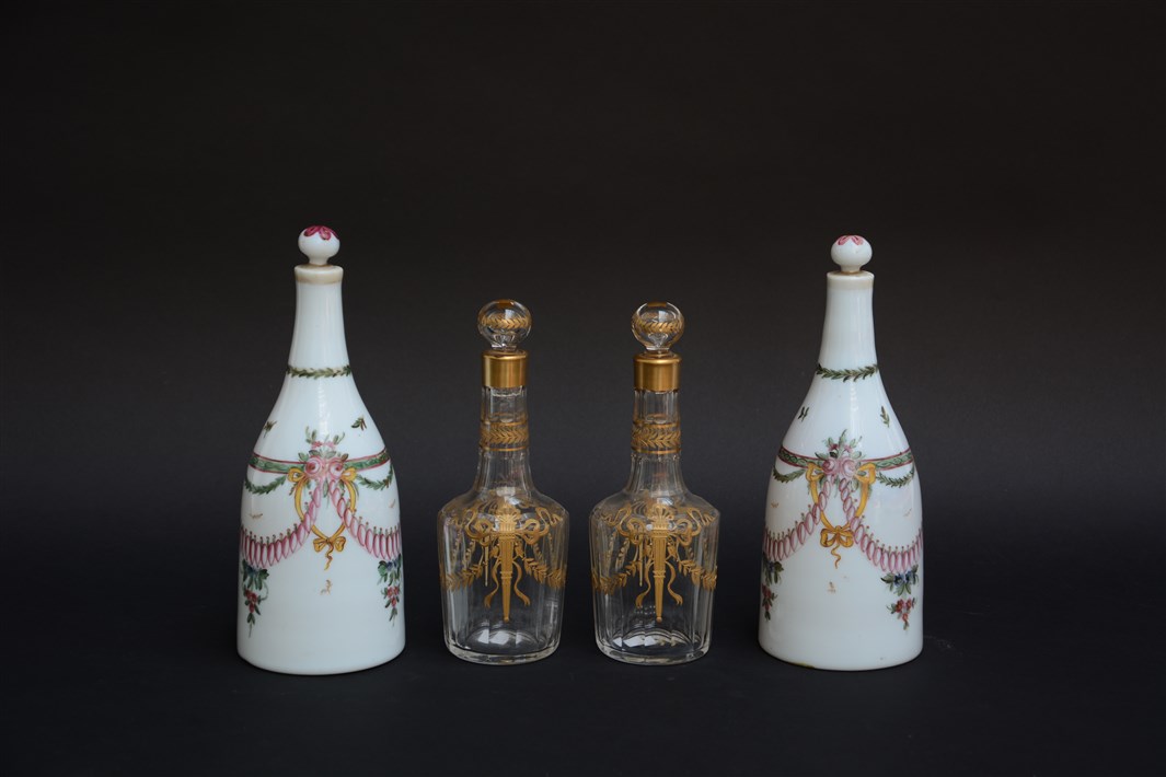 Lotto composto da una coppia di bottiglie in opaline decorate a freddo in policromia a vasi e festoni fioriti ed una in vetro incolore decorata con dorature a faretre e foglie di alloro. Secolo XIX (h. massima cm 27)