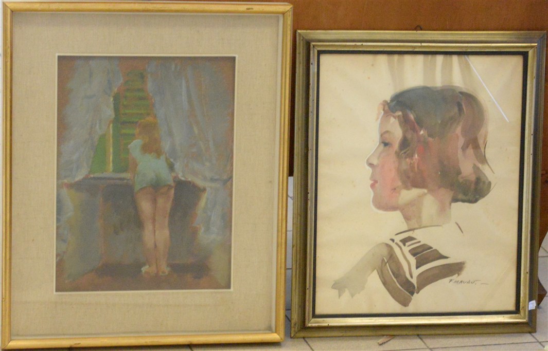 Lotto di un acquarello e un dipinto ad olio raffiguranti fanciulli, autori e misure diverse, in cornici (difetti)