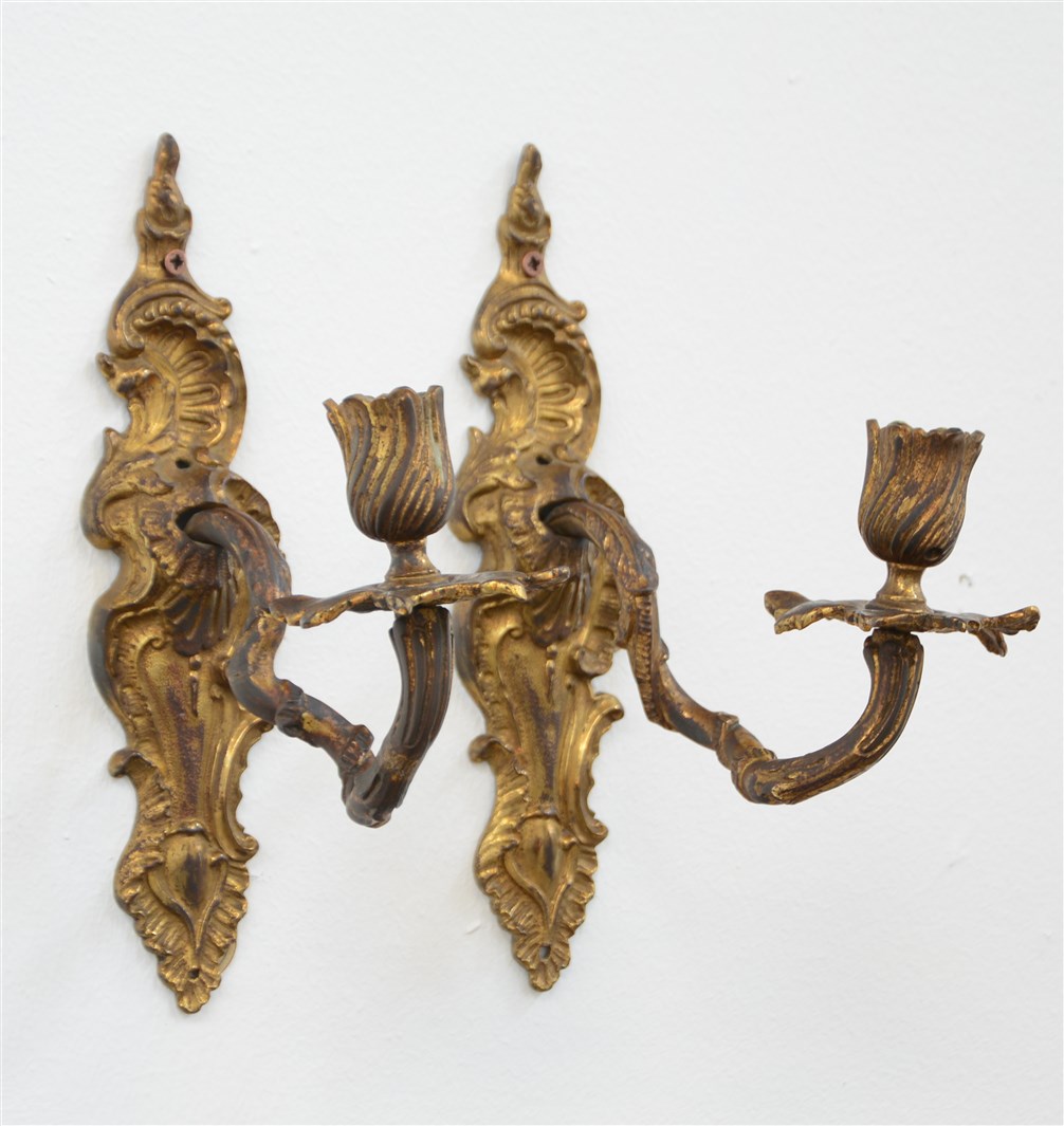 Coppia di appliques ad una fiamma in bronzo dorato (h. cm 24) (difetti)