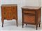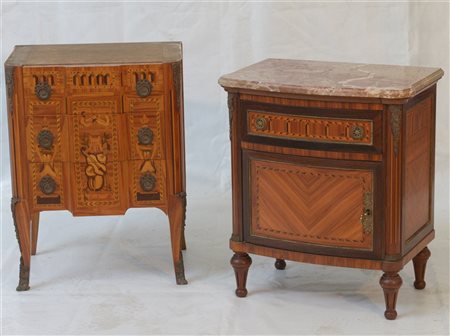 Lotto composto da due mobiletti con ante e cassetti intarsiati in legni vari co
