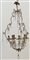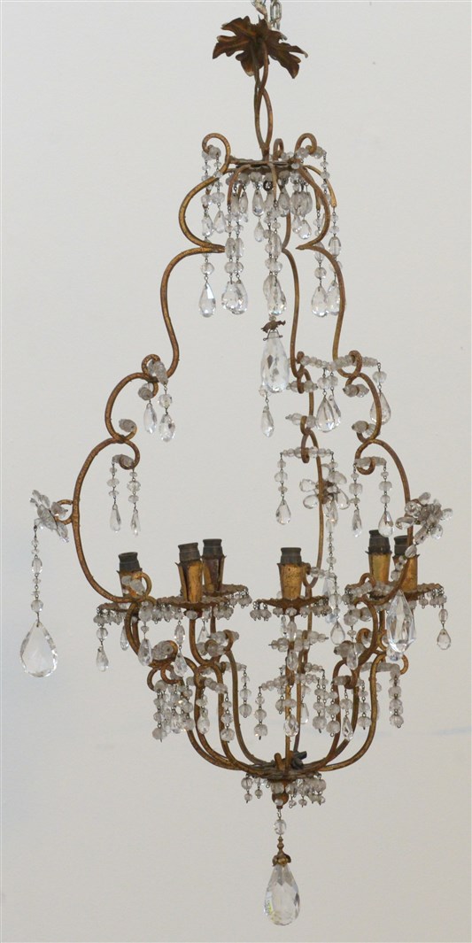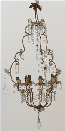 Lampadario a cesto a sei fiamme con struttura in metallo dorato decorata da pendenti. Secolo XIX (h. cm 90) (difetti e mancanze)