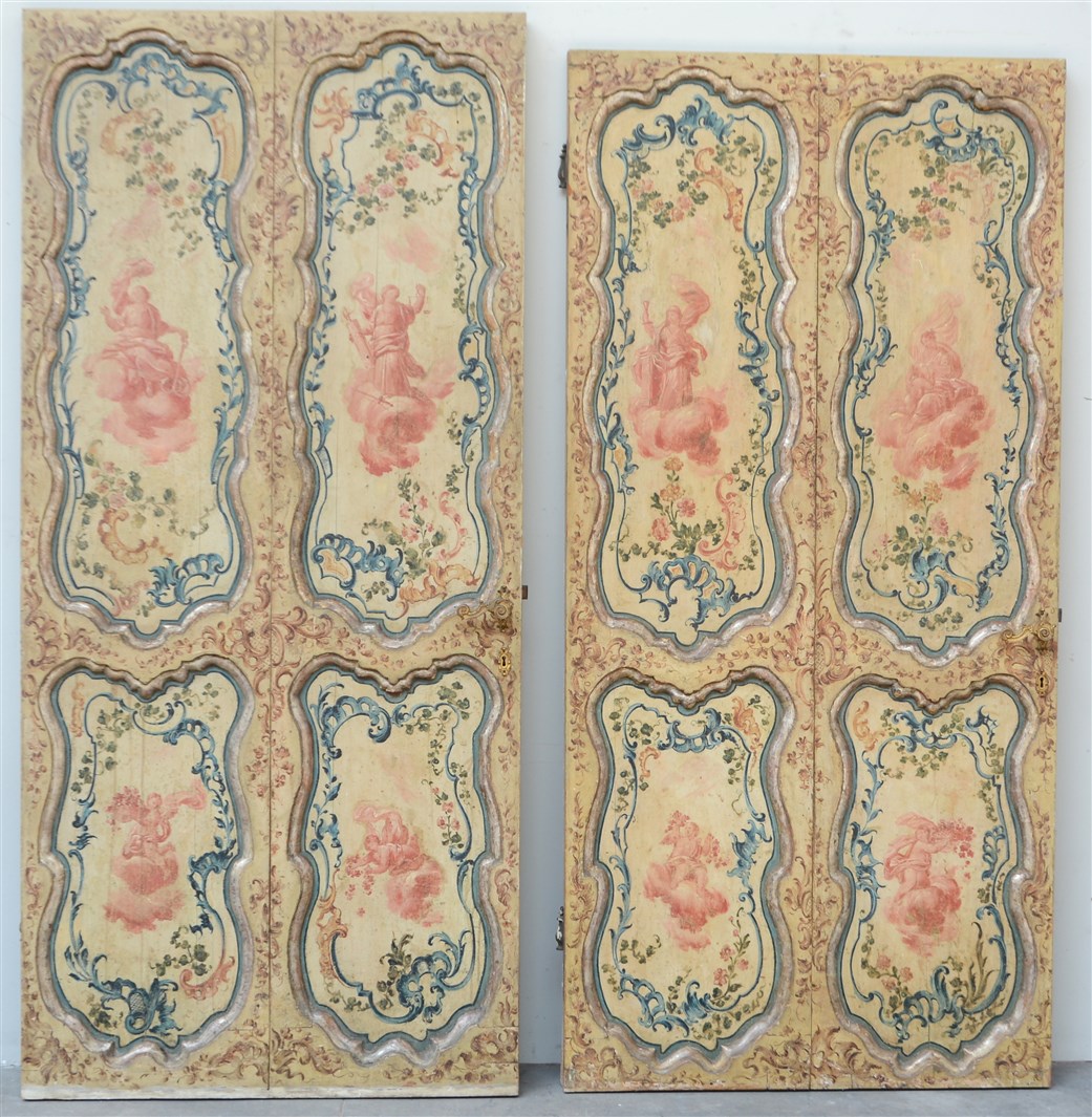 Coppia di porte quadripartite decorate a volute e a soggetti monocromi classici