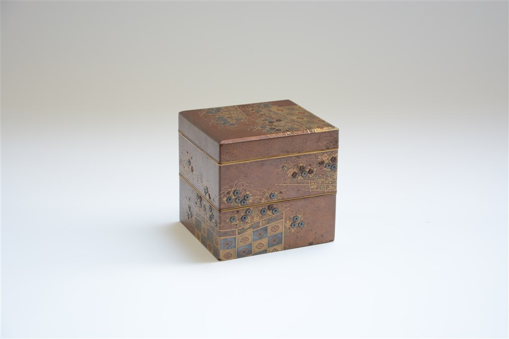 Scatola da scrittura a tre scomparti lacca con inserti in metallo decorata con motivi floreali e geometrici (difetti) (cm 14x12x14) Giappone, sec. XX