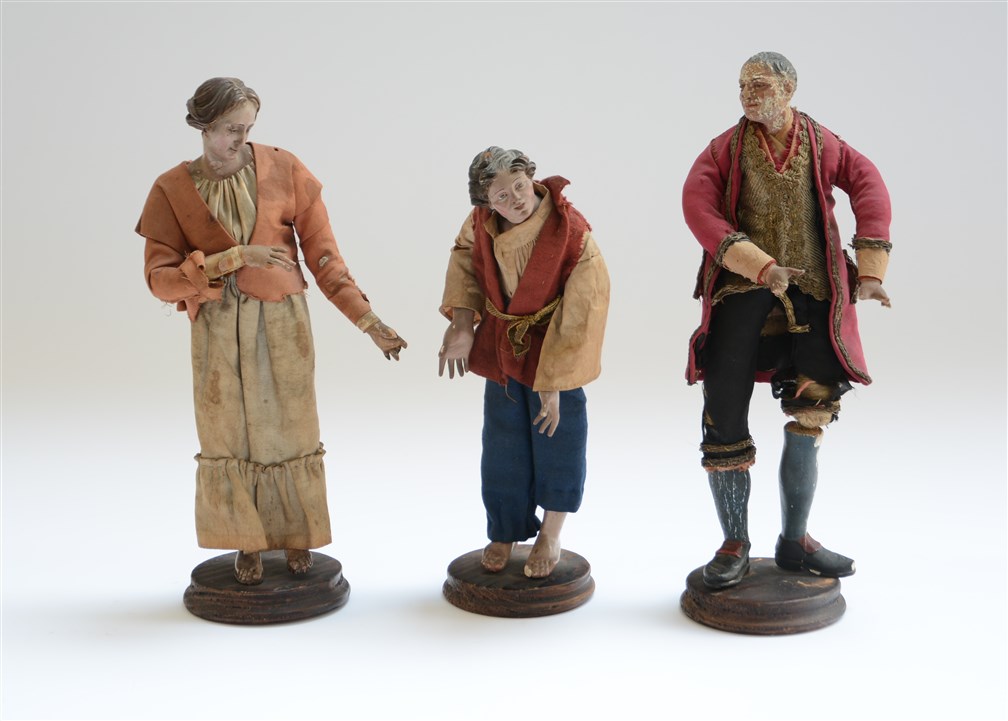 Lotto composto da tre figure da presepe del secolo XIX raffiguranti pastori con