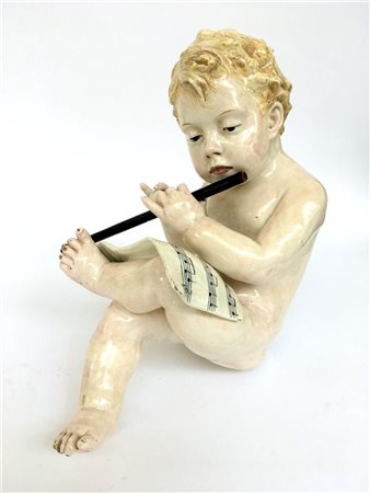 Scultura in ceramica policroma raffigurante un amorino musicista con flauto in