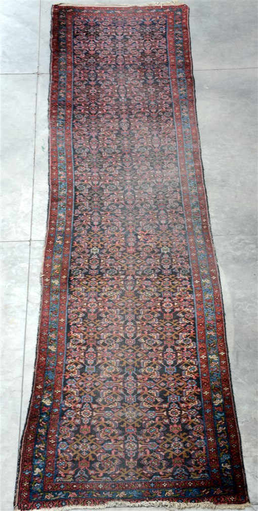 Tappeto passatoia Malayer persia secolo XX. Disegno Herati su fondo blu notte (cm 415x98) (difetti e restauri)