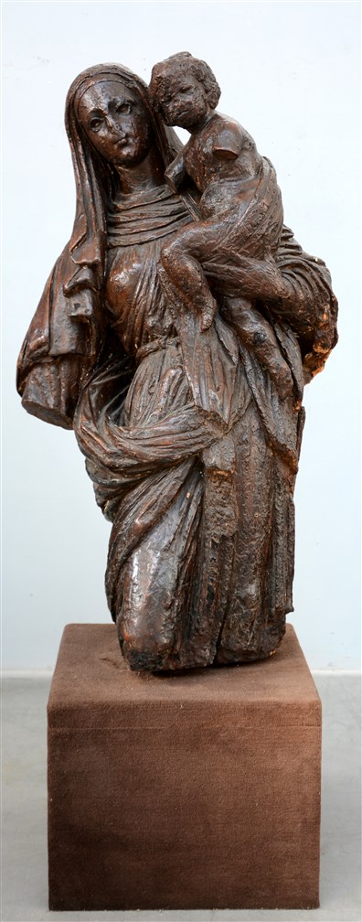 Antitca scultura lignea raffigurante Madonna con Bambino (h. cm 126) poggiante su basamento (difetti restauri e mancanze)
