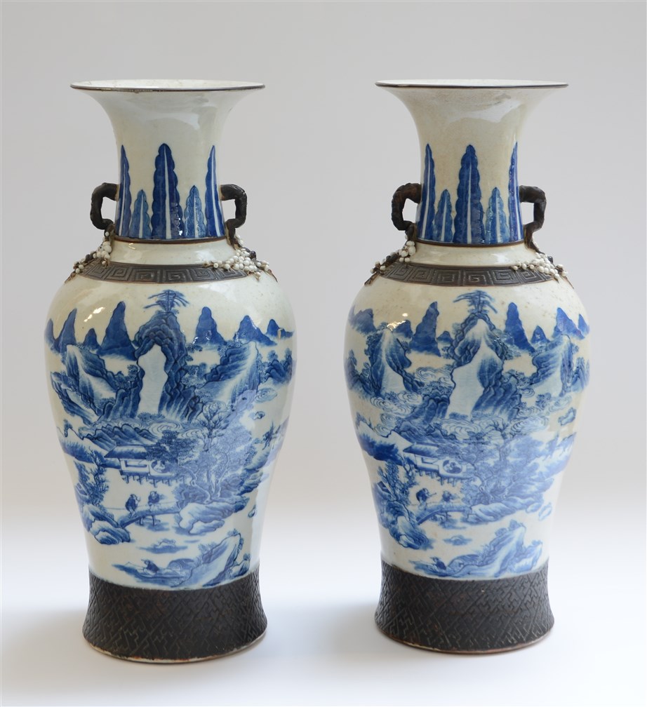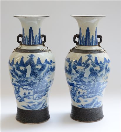 Coppia di vasi biansati a balaustro in porcellana bianca e blu su fondo craquelè decorati con paesaggi, con bande geometriche ad imitazione del bronzo, marchio apocrifo alla base (h. cm 60) (difetti e restauri) Cina, inizio sec. XX